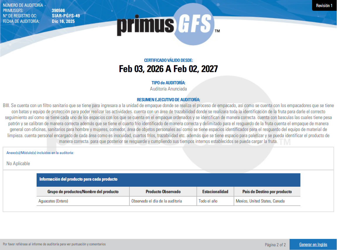 Nuestra empacadora cuenta con la certificación PrimusGFS, un estándar internacional que avala el cumplimiento estricto de los protocolos de inocuidad, higiene, trazabilidad y control de procesos dentro de nuestras operaciones de empaque. Esta certificación, obtenida con una calificación final del 100%, garantiza que nuestros procesos están alineados con las mejores prácticas globales en seguridad alimentaria, asegurando un producto confiable, seguro y apto para los mercados más exigentes a nivel nacional e internacional.